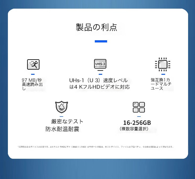 【主な付属品】microSD → SD変換アダプター、ご利用の手引き ※製品本体はアダプターに挿入された状態で梱包されています。
